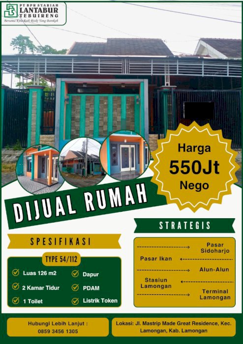 Luas Tanah: 126 M2Luas Bangunan: 99 M2Kamar Tidur: 2Kamar Mandi: 1Tingkat: 1Dijual Rumah Strategis dan Nyaman - Dekat Pusat KotaHarga: Rp 550.000.000Luas Bangunan: 99 mLuas Tanah: 126 mKamar Tidur: 2Kamar Mandi: 1Sertifikat: SHM (Sertifikat Hak Milik)Alamat: Perumahan Made Great Blok B5 No.1, Kec. Lamongan, Kab. Lamongan- Kondisi: Second (Bangunan Bekas)- Luas Jalan Depan Rumah: 6 meter muat mobil papasan- Konstruksi Bangunan Sudah Support untuk Lantai 2 Keunggulan Lokasi:- Dekat pusat kota Lamongan- Akses mudah ke fasilitas umum seperti sekolah, pasar, rumah sakit, dan pusat perbelanjaan- Lingkungan perumahan tenang dan nyaman Hubungi Pemilik Langsung:Udin - 0859-3456-1305#rumahbaru #rumahterlaris #rumahterbaru #rumahdijual #rumahlamongan